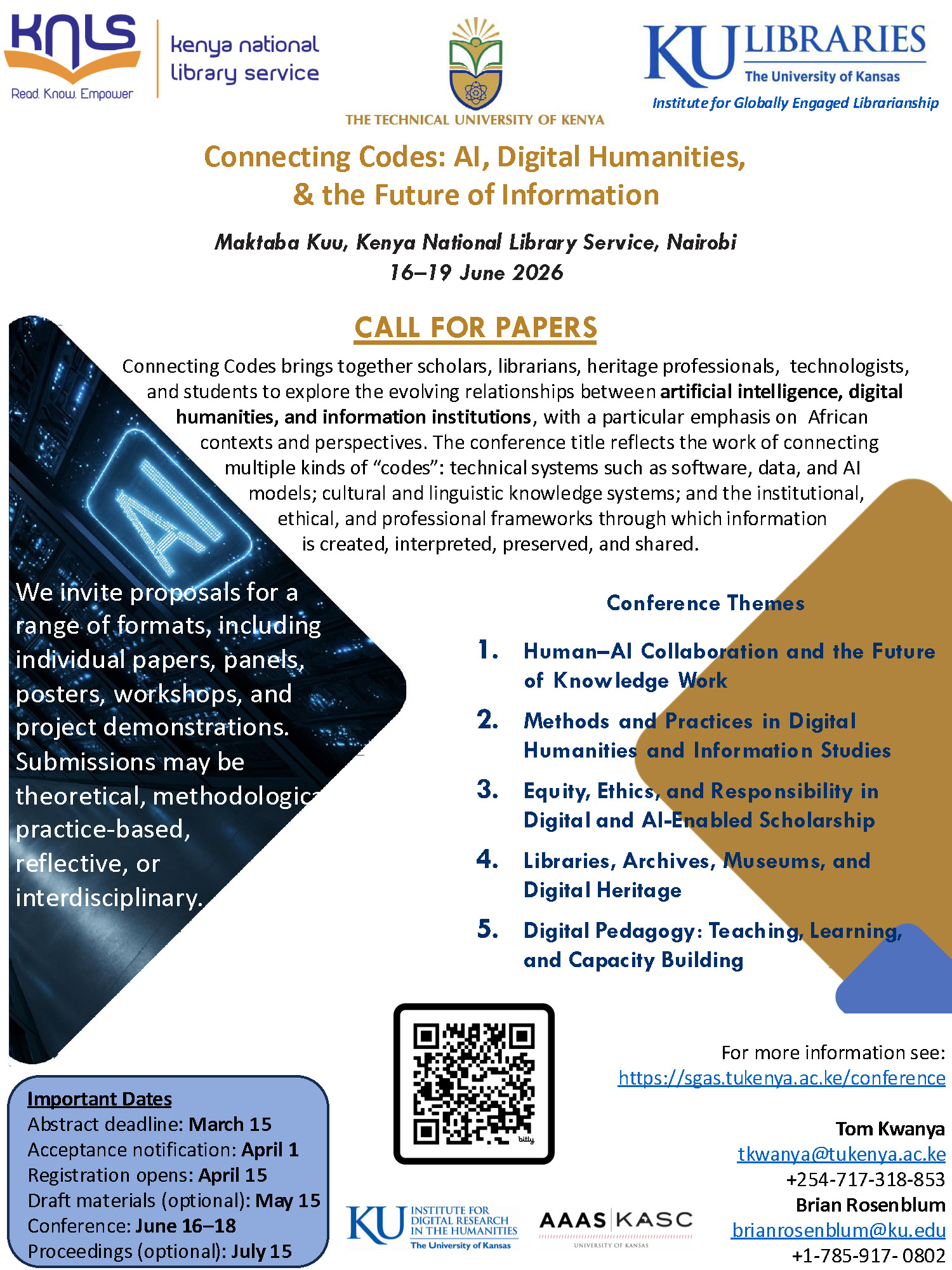 Dear all, I am sharing this on behalf of Brian Rosenblum: Dear colleagues, I hope this message finds you well. I want to let everyone know about an upcoming conference. Connecting Codes: AI, Digital Humanities, and the Future of Information will take place in on June 16-18, 2026 at Kenya National Library Service in Nairobi. The event is co-organized by the Technical University of Kenya, the Kenya National Library Service, and the University of Kansas Libraries. The CFP was just released this week, and we are accepting proposals for both in-person and virtual presentations. https://sgas.tukenya.ac.ke/conference Feel free to share information about the event. A full CFP and a flyer are attached. And of course, we’d love if you submitted a proposal! Warm regards to all, Brian -- Prof Menno van Zaanen [email protected] Professor in Digital Humanities South African Centre for Digital Language Resources https://www.sadilar.org ________________________________ NWU PRIVACY STATEMENT: http://www.nwu.ac.za/it/gov-man/disclaimer.html DISCLAIMER: This e-mail message and attachments thereto are intended solely for the recipient(s) and may contain confidential and privileged information. Any unauthorised review, use, disclosure, or distribution is prohibited. If you have received the e-mail by mistake, please contact the sender or reply e-mail and delete the e-mail and its attachments (where appropriate) from your system. ________________________________