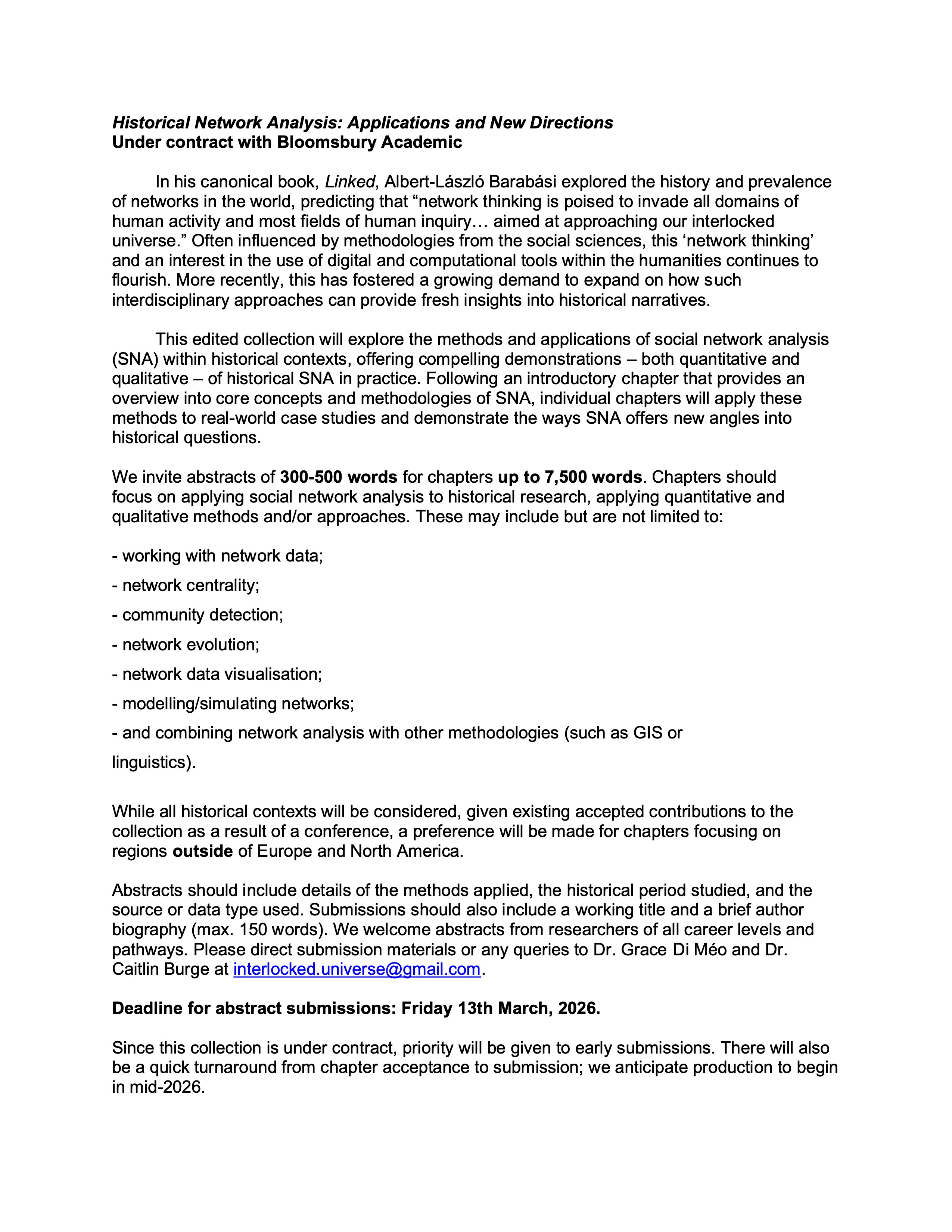 Dear EADH community, Below, I am sharing the CfP for contributions to an edited collection in Historical Network Analysis. Best regards, Jiri Kocian EADH Secretary _____ Dear EADH team, I hope you’re keeping well. I’m just emailing to share details for an edited collection in Historical Network Analysis The call for chapters is now open, with a deadline for abstracts of Friday 13th March. I’ve attached a PDF version of the CfP for sharing on social media and in newsletters etc., which can also be found in text format below. Further details or queries can be made to myself and Dr. Grace Di Meo at [ mailto:[email protected] | [email protected] ] . Many thanks for your time. Best wishes, Caitlin ——— Historical Network Analysis: Applications and New Directions Under contract with Bloomsbury Academic In his canonical book, Linked , Albert-László Barabási explored the history and prevalence of networks in the world, predicting that “network thinking is poised to invade all domains of human activity and most fields of human inquiry… aimed at approaching our interlocked universe.” Often influenced by methodologies from the social sciences, this ‘network thinking’ and an interest in the use of digital and computational tools within the humanities continues to flourish. More recently, this has fostered a growing demand to expand on how such interdisciplinary approaches can provide fresh insights into historical narratives. This edited collection will explore the methods and applications of social network analysis (SNA) within historical contexts, offering compelling demonstrations – both quantitative and qualitative – of historical SNA in practice. Following an introductory chapter that provides an overview into core concepts and methodologies of SNA, individual chapters will apply these methods to real-world case studies and demonstrate the ways SNA offers new angles into historical questions. We invite abstracts of 300-500 words for chapters up to 7,500 words . Chapters should focus on applying social network analysis to historical research, applying quantitative and qualitative methods and/or approaches. These may include but are not limited to: - working with network data; - network centrality; - community detection; - network evolution; - network data visualisation; - modelling/simulating networks; - and combining network analysis with other methodologies (such as GIS or linguistics). While all historical contexts will be considered, given existing accepted contributions to the collection as a result of a conference, a preference will be made for chapters focusing on regions outside of Europe and North America. Abstracts should include details of the methods applied, the historical period studied, and the source or data type used. Submissions should also include a working title and a brief author biography (max. 150 words). We welcome abstracts from researchers of all career levels and pathways. Please direct submission materials or any queries to Dr. Grace Di Méo and Dr. Caitlin Burge at [ mailto:[email protected] | [email protected] ] . Deadline for abstract submissions: Friday 13th March , 2026. Since this collection is under contract, priority will be given to early submissions. There will also be a quick turnaround from chapter acceptance to submission; we anticipate production to begin in mid-2026. Dr Caitlin Burge Taighdeoir Iardhochtúireachta | Postdoctoral Researcher STEMMA: Systems of Transmitting Early Modern Manuscript Verse, 1475-1700 Scoil an Bhéarla agus na nEalaíon Cruthaitheach School of English and Creative Arts Recent Publications Burge, Caitlin. ‘The King’s Gatekeeper: Thomas Cromwell, Epistolary Networks, and Power Structures at the Tudor Court, January–July 1540.’ Huntington Library Quarterly 86, no. 2 (2024): pp. 257 – 281. DOI: [ https://doi.org/10.1353/hlq.2023.a936418 | https://doi.org/10.1353/hlq.2023.a936418 ] Burge, Caitlin. 'Fragmentation and Disruption: Ranking Cut-Points in Epistolary Networks and the Court of Henry VIII.' Journal of Historical Network Research 10, no.1 (2024): pp. 122 - 149. DOI: [ https://doi.org/10.25517/jhnr.v10i1.99 | https://doi.org/10.25517/jhnr.v10i1.99 ] Burge, Caitlin. 'Mapping the Archives: Epistolary Networks and the State Papers of England, 1523-1540.' International Journal of Humanities and Arts Computing 18, no.1 (2024): pp. 95-108. DOI: [ https://doi.org/10.3366/ijhac.2024.0323 | https://doi.org/10.3366/ijhac.2024.0323 ] [ https://x.com/CaitlinBurge95 | Twitter ] | [ https://www.linkedin.com/in/caitlin-burge-9887a019b | LinkedIn ] | [ https://bsky.app/profile/caitlinburge.bsky.social | Bluesky ] [ https://www.universityofgalway.ie/ ] [ https://www.universityofgalway.ie/ ] Uimhir Carthanachta Cláraithe/Registered Charity Number 20002107